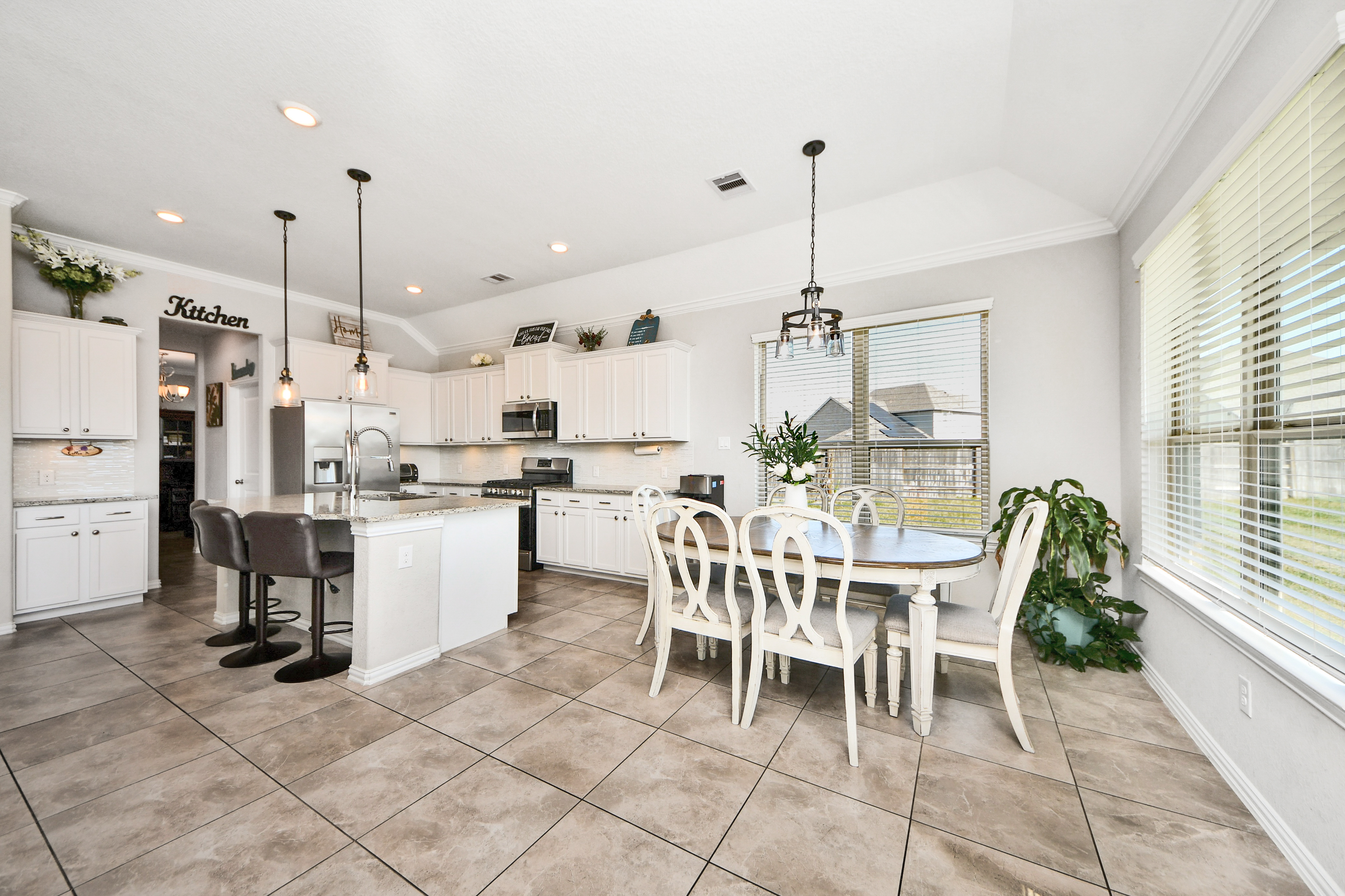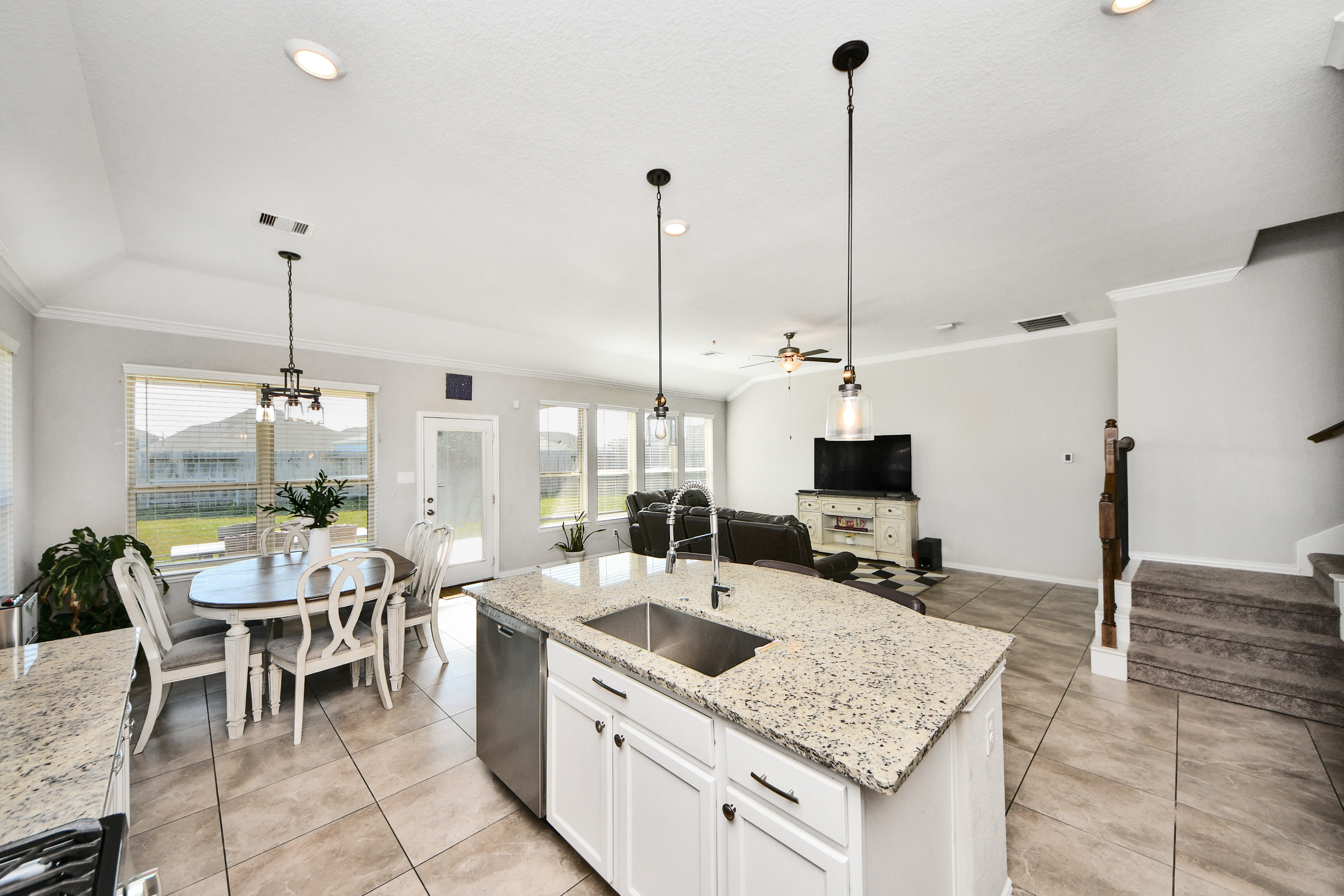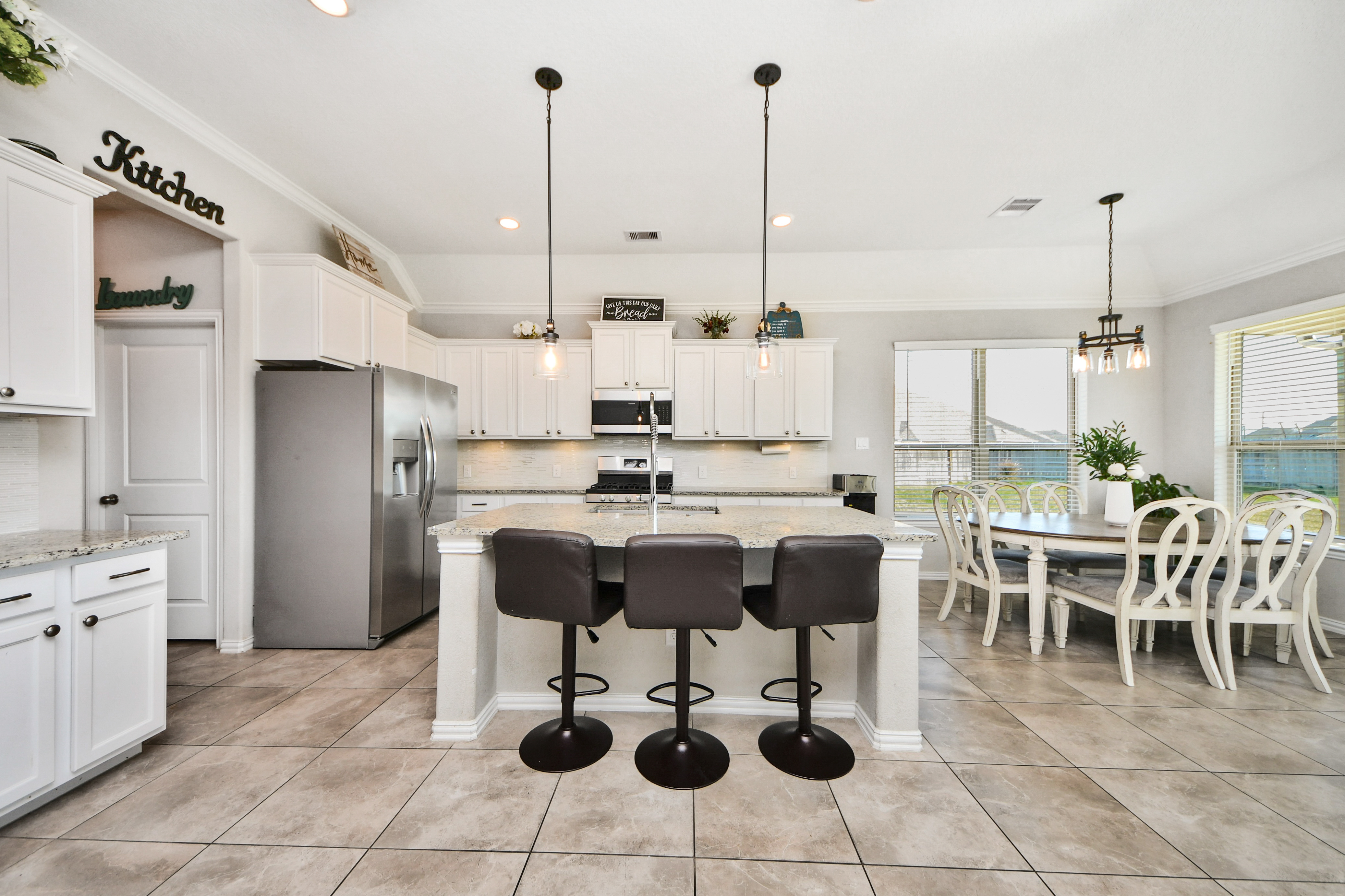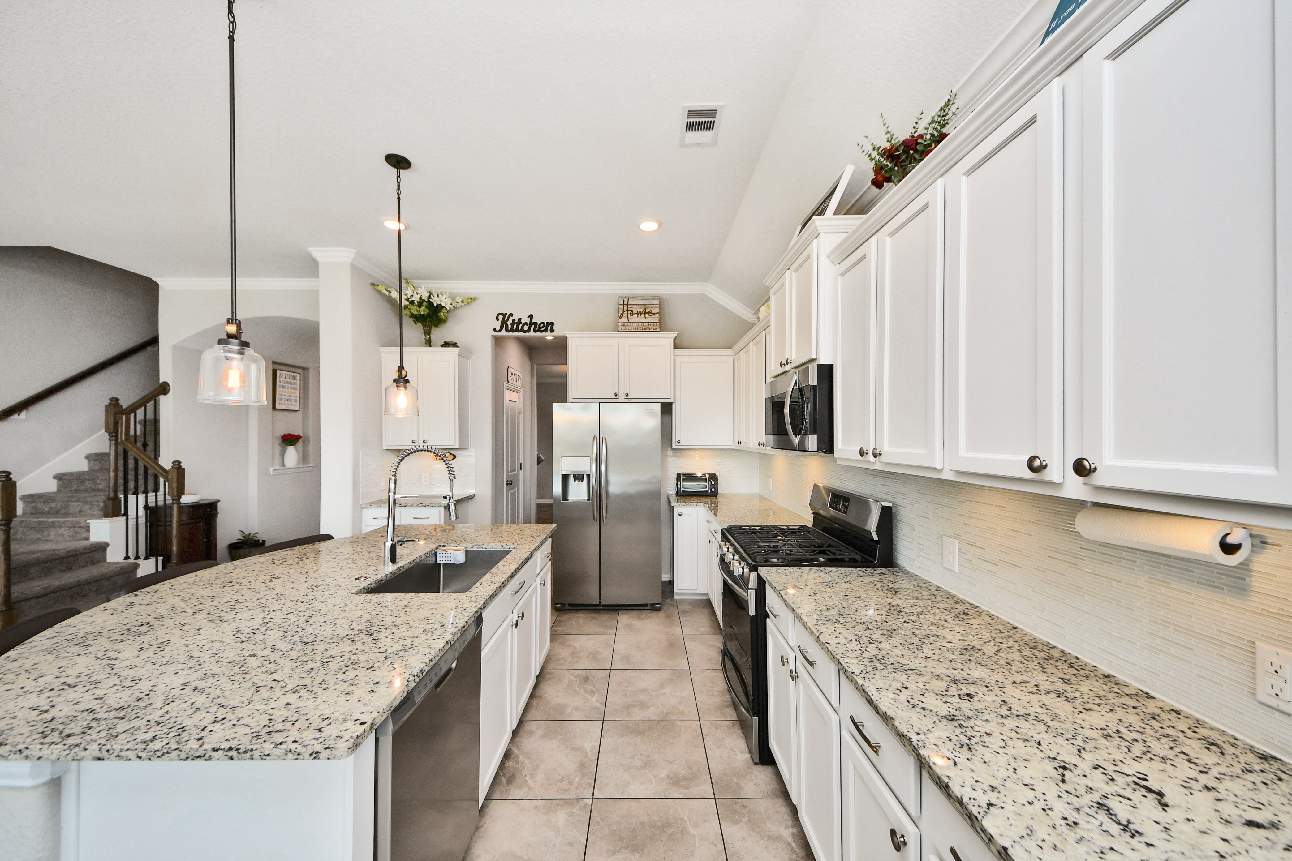 Inside, the home offers an open-concept layout with high ceilings, abundant natural light, and a modern kitchen with white cabinetry, granite countertops, stainless steel appliances, a large island with seating, and a pantry.